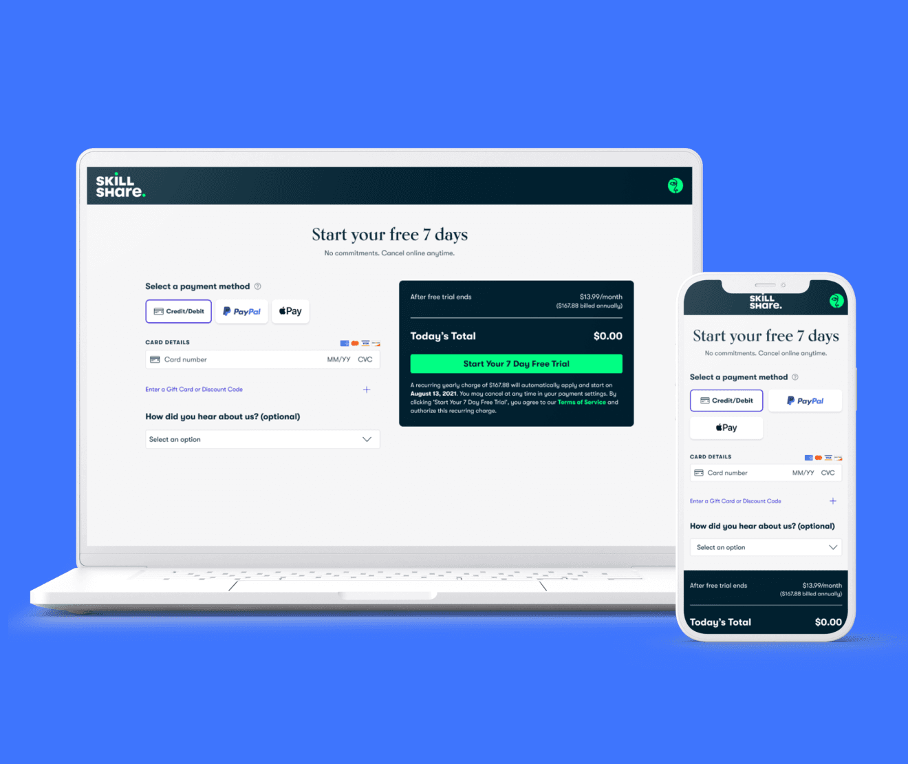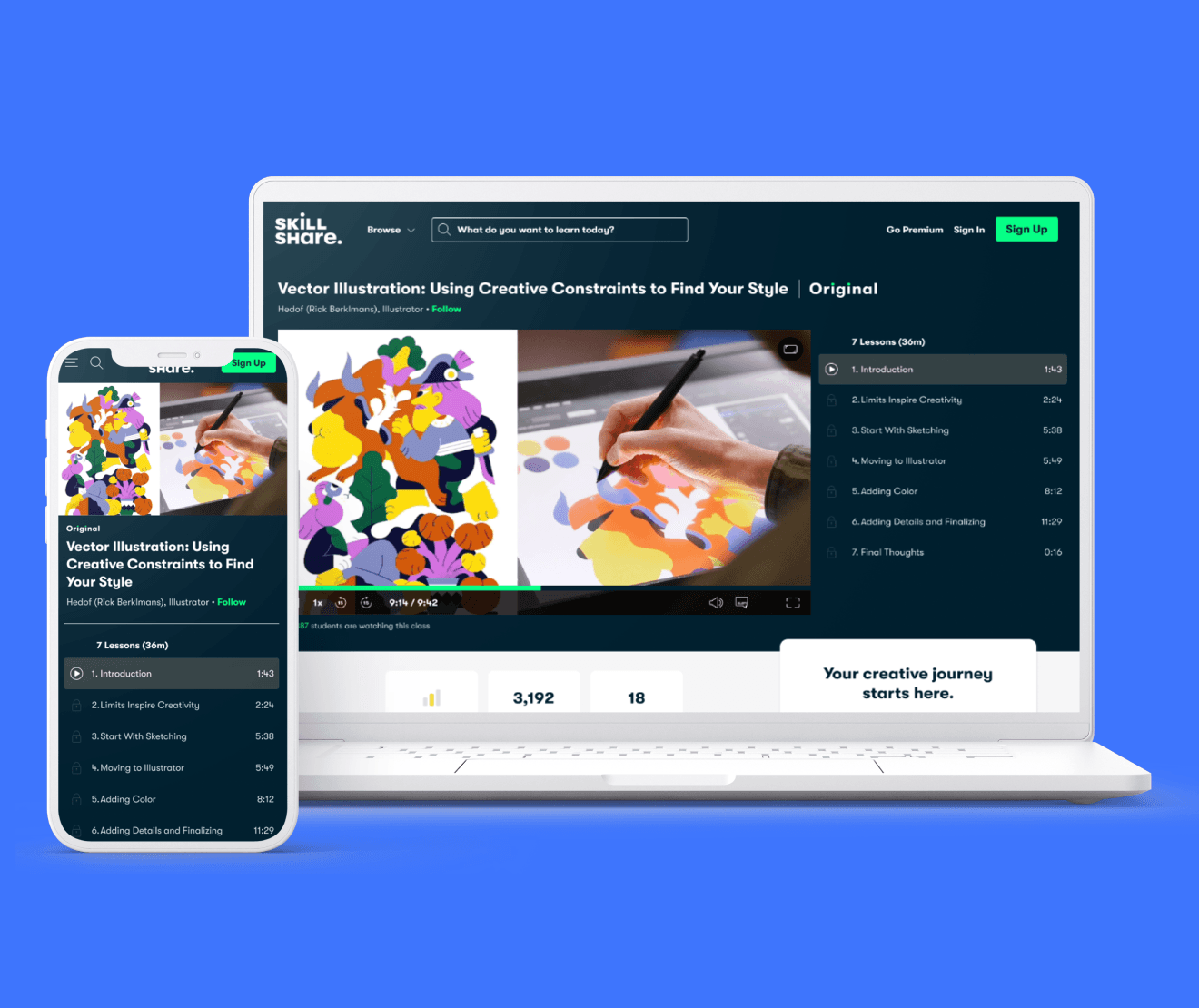 I joined Skillshare when it was a small design team, so I wore a lot of hats. I gained experience in user research (quantitative & qualitative), growth design, design systems, mobile app design, checkout design, A/B testing, roadmap strategy, & design team management. I mentored junior designers, contributed to a full-site rebrand, and designed projects that drove measurable increases in conversion and retention.